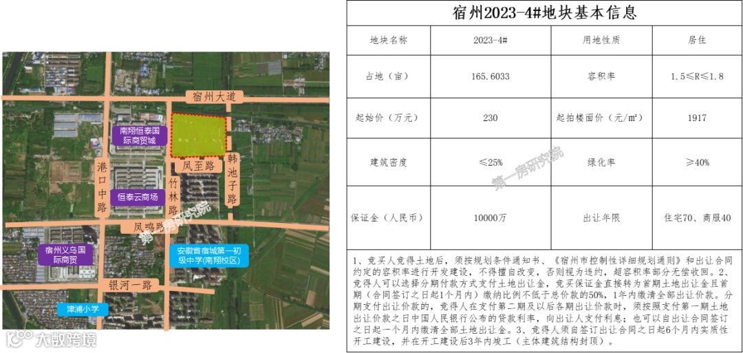 2023-4#地块北侧紧邻城市主干道宿州大道,交通便利,周边1公里内有宿州市第十一小学教育集团(东校区)、安徽省宿城第一初级中学(南翔校区),3公里内有宿州市第一人民医院、利民医院,教育医疗资源优越,地块西侧为恒泰云商城和义乌国际商贸城,资源配套完善。