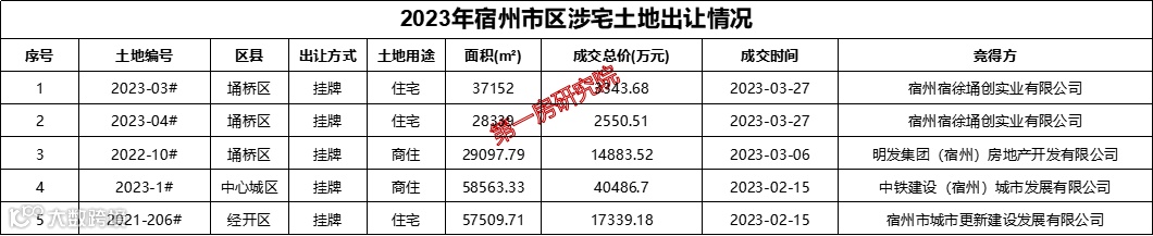 截止到目前,今年宿州市区涉宅用地共成交5宗,合计面积21.07万方。