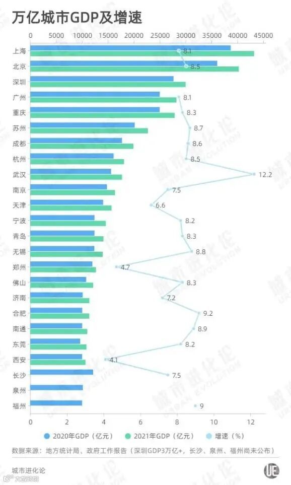 GDP增速方面,目前已公布数据的万亿城市中,共有14城实际增速超过全国平均水平(8.1%),其中合肥仅次于武汉,以9.2%的增速排名第二。