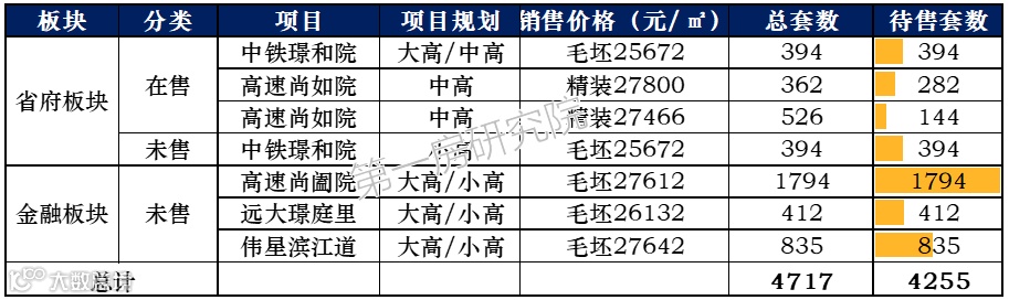存量分析:区域整体在售未售存量4255套(约51万方),去化周期3.5个月;从结构来看,主力集中在金融板块未售项目上,占比71%;