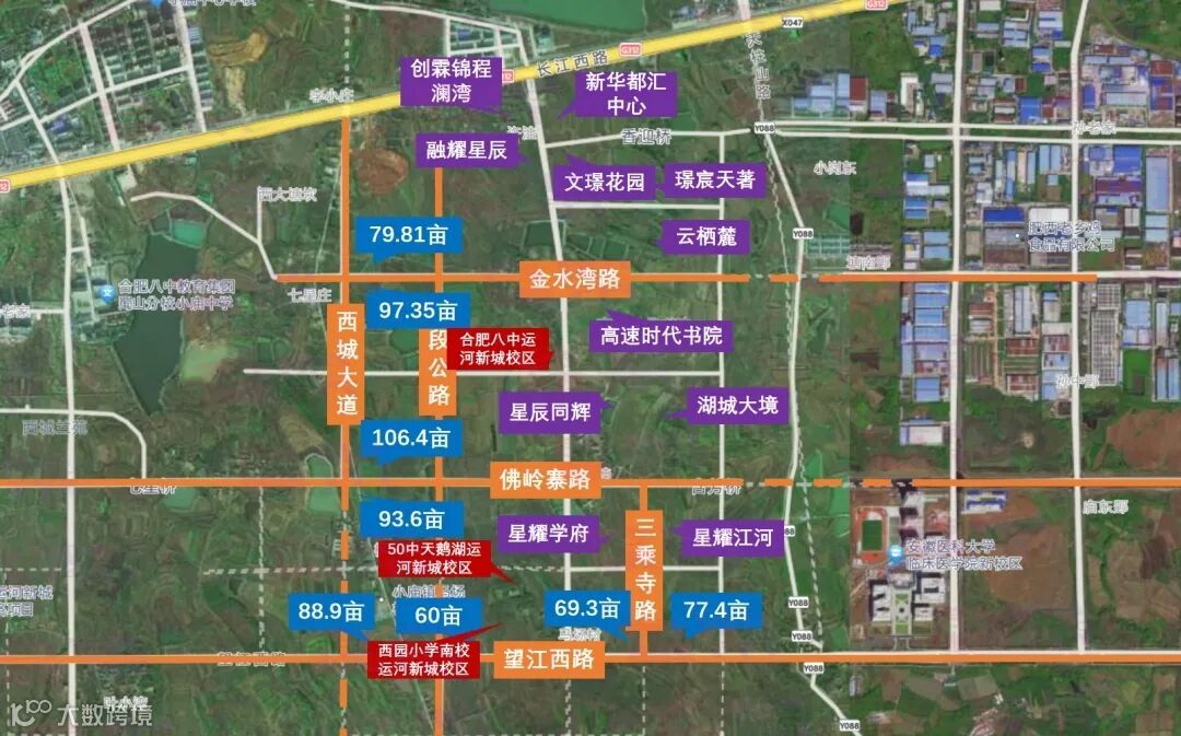 其中,沿着望江西路北侧分布的4宗地块,紧邻新华星耀学府、新华星耀学府等楼盘,距离五十中天鹅湖校区运河新城校区+西园小学南校运河新城校区也都比较近。