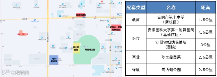 高新区GX202110号地块位于高新区方兴大道西板块,板块内目前没有自己的学区,小学可以选择合肥市高新创新三小或梦园小学教育集团文曲路学校,中学可以选择永和学校或梦园中学西区入学,上学路程相对较远。得益于蜀西湖板块的配套资源辐射,周边有安徽医科大学第一附属医院(高新院区)、安徽省妇幼保健院(西院)、砂之船奥莱、蜀西湖公园等,均距离地块直线距离5公里以内。