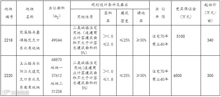 备注:(1)根据“关于印发《宣城市加快推进新建商品房‘交房即办证’改革实施方案》的通知及规划条件要求,2218号、2220号两宗地块受让人应满足国有建设用地使用权及房屋所有权首次登记后方可交房。