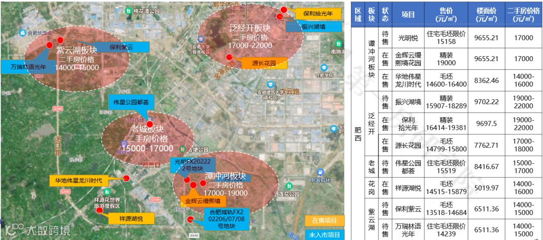肥西目前在售新房价格毛坯限价15158元/㎡,主力在售项目价格14515-17158元/㎡,二手房价格14000-22000元/㎡,其中泛经开板块新房和二手房价格倒挂明显。