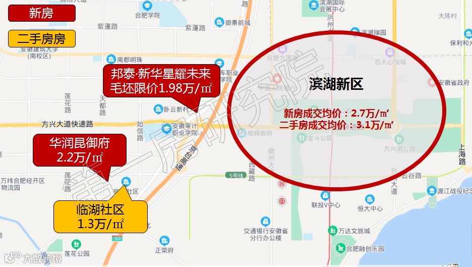 1、从新房价格上来看,经开工业园板块新房价格在2.2-2.3万/㎡,滨湖的新房价格在2.7万/㎡,一路之隔,单方差价近5000元。所以经开工业园板块在一定程度上能承接滨湖的外溢客户。