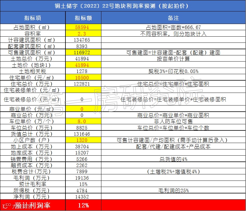 结合地块周边项目售价情况,考虑到目标地块周边无在售项目,按照地块起拍价测算,住宅按照均价10500元/㎡,车位8万/个,(2022)22号地块利润率约12%,利润空间较大。