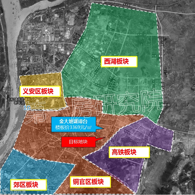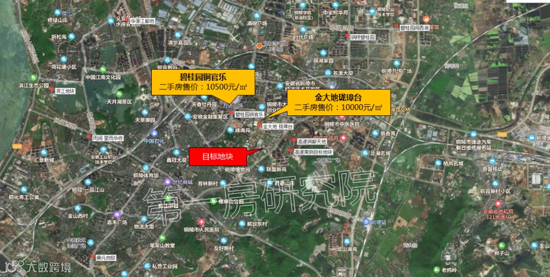 板块无在售楼盘,目标地块附近的两个楼盘二手房情况,碧桂园铜官乐项目二手房均价10500元/㎡;金大地珑璋台项目二手房均价10000元/㎡。
