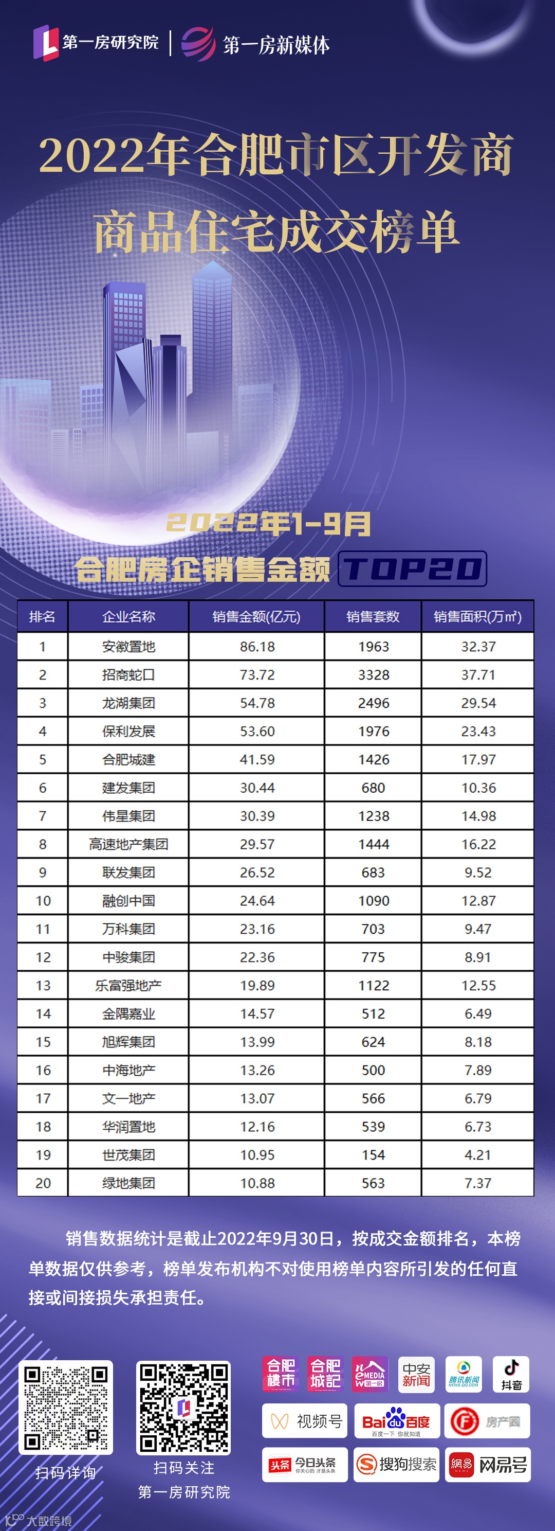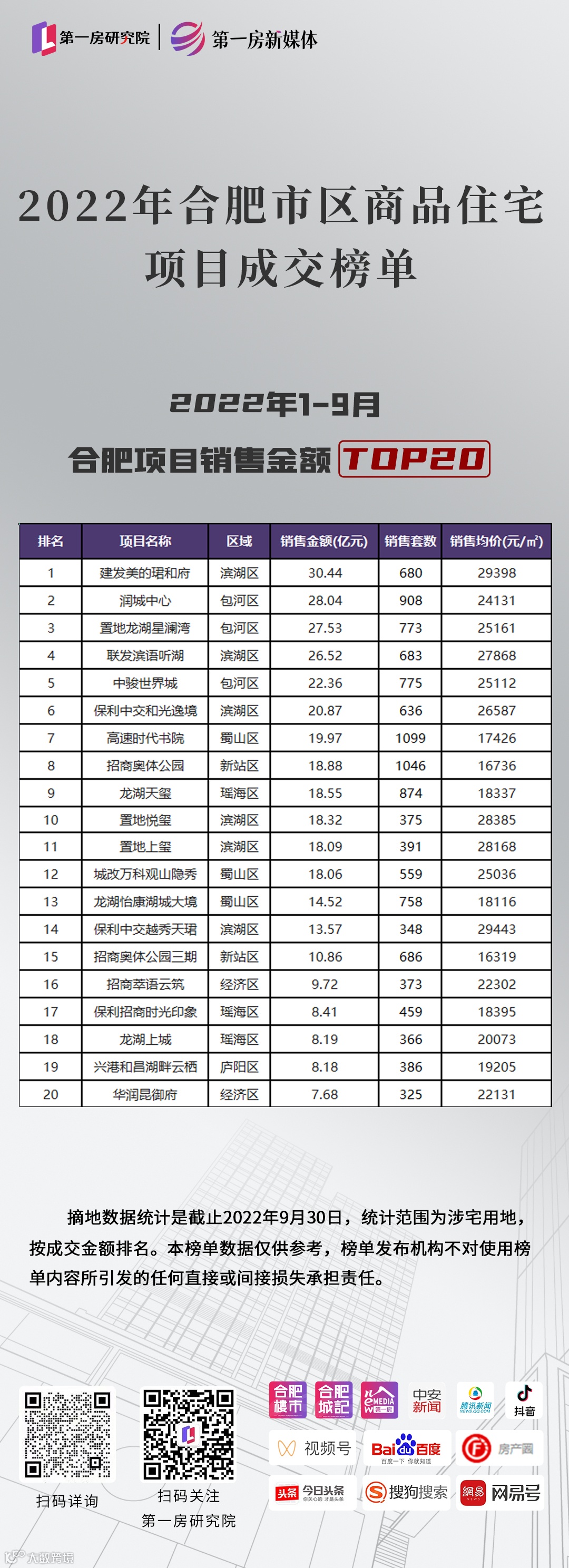 AI楼市大数据显示,合肥1-9月最新排行榜单发布,下面让我们一起来看看各区、各项目、房企TOP20情况!