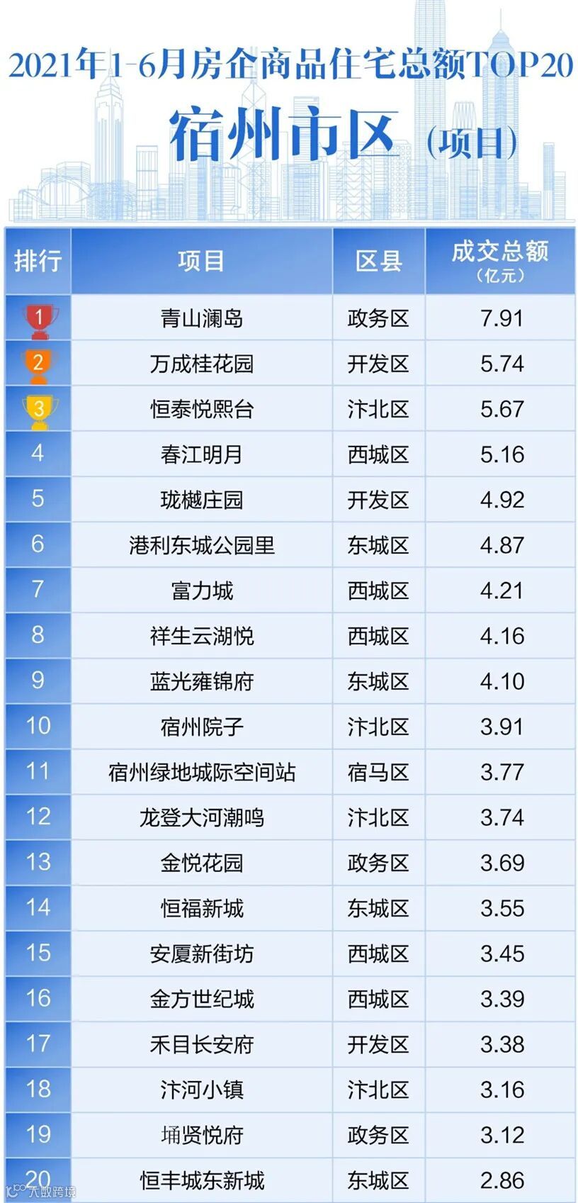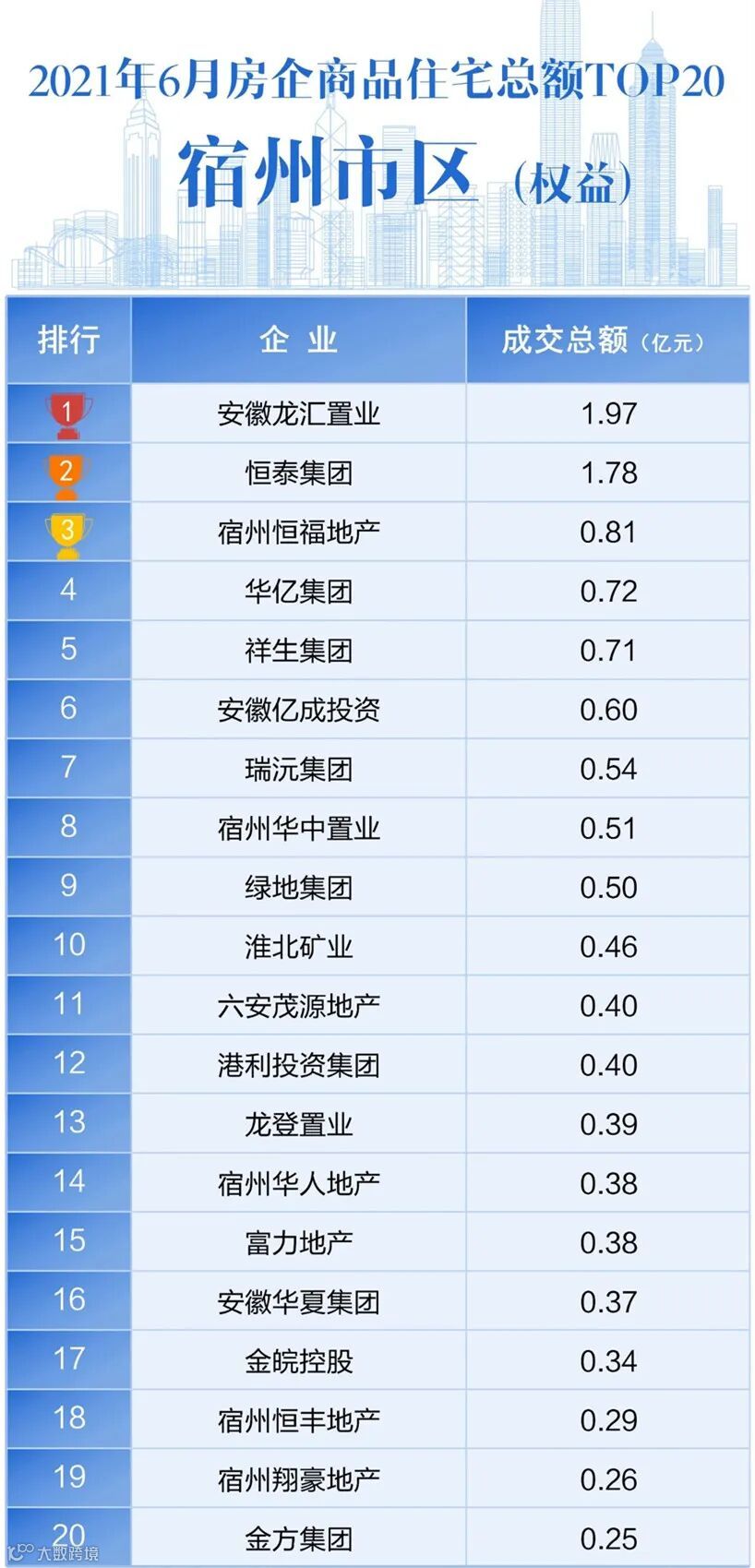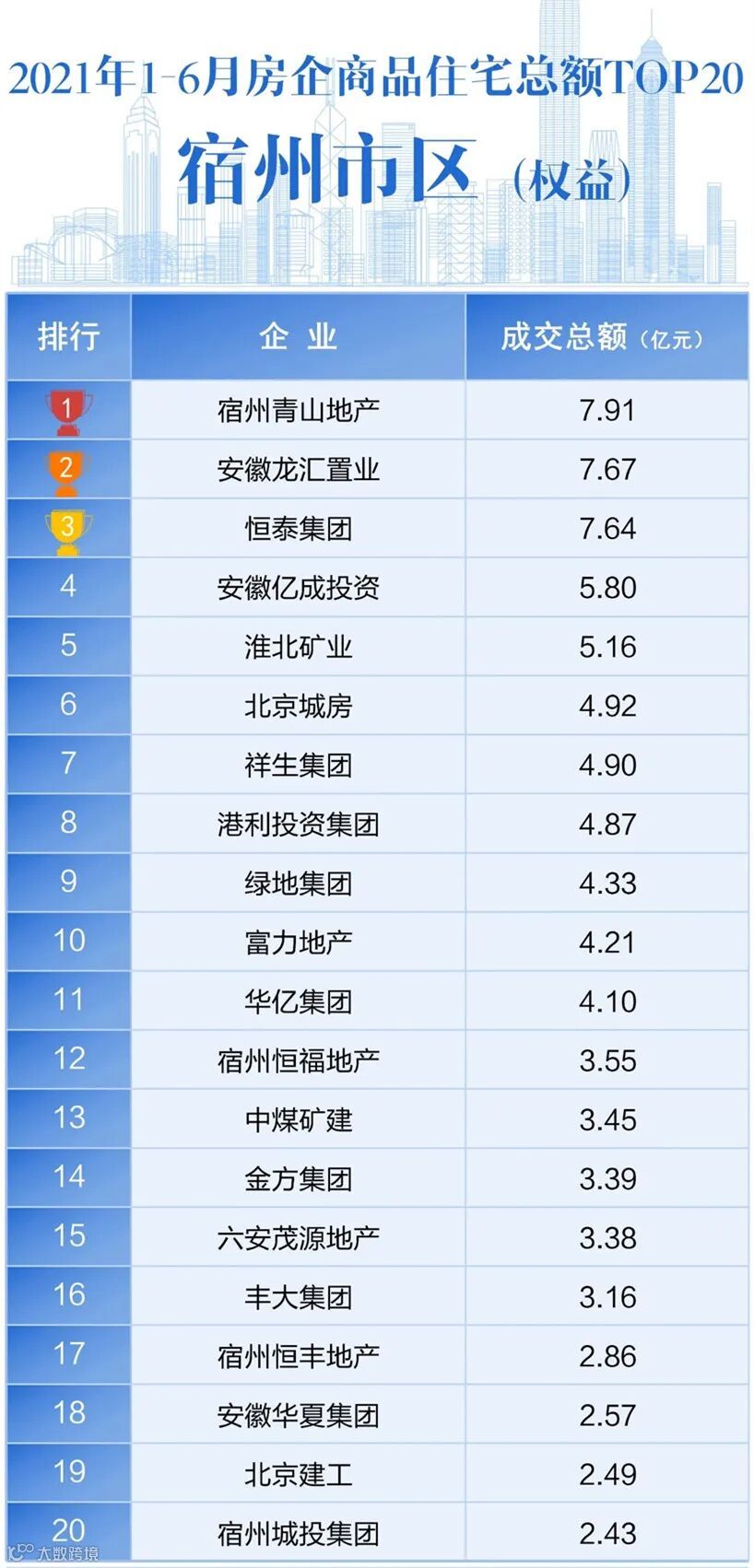 3、企业除宿州地区外(仅包含城中八区)销售数据不予计入,只包含宿州地区商品住宅的销售数据;物业租赁及管理、酒店经营、物业服务等产生的收益数据不予计入。