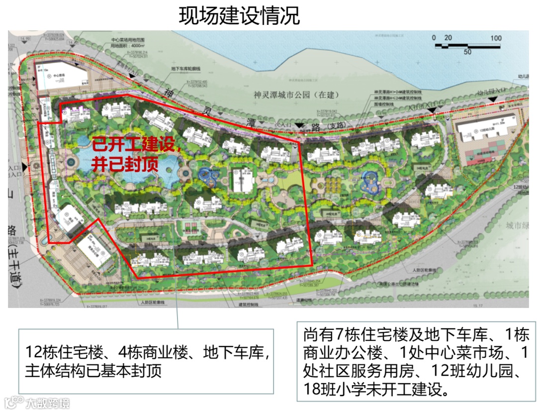 目前该地块有12栋住宅楼、4栋商业楼及地下车库的主体结构已基本封顶,尚有7栋住宅楼及地下车库、1栋商业办公楼、1处中心菜市场、1处社区服务用房、12班幼儿园、18班小区尚未开工建设。根据本次出让公告,竞得人须按规划条件和批准的规划建筑设计方案,无条件完成地块开发建设(包含已有在建工程的剩余工程量)。