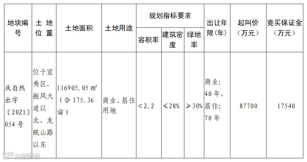 地块位于安庆市宜秀区,龙眠山路与振风大道交口东北角,总面积175.36亩,规划用地性质为商业、居住用地,其中:住宅计容建筑面积占总计容建设面积比例≤89%,商业、商务计容建筑面积占总计容建设面积比例≥11%。