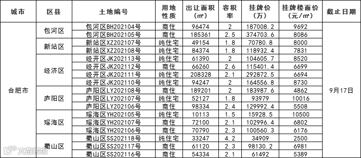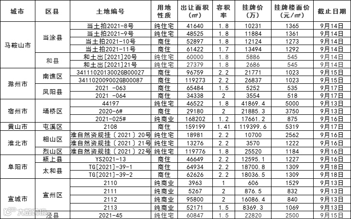 下周(9.13-9.19)马鞍山、滁州、宿州、黄山、淮北、阜阳、宣城计划出让37宗地,其中涉宅用地30幅,商业用地7幅。