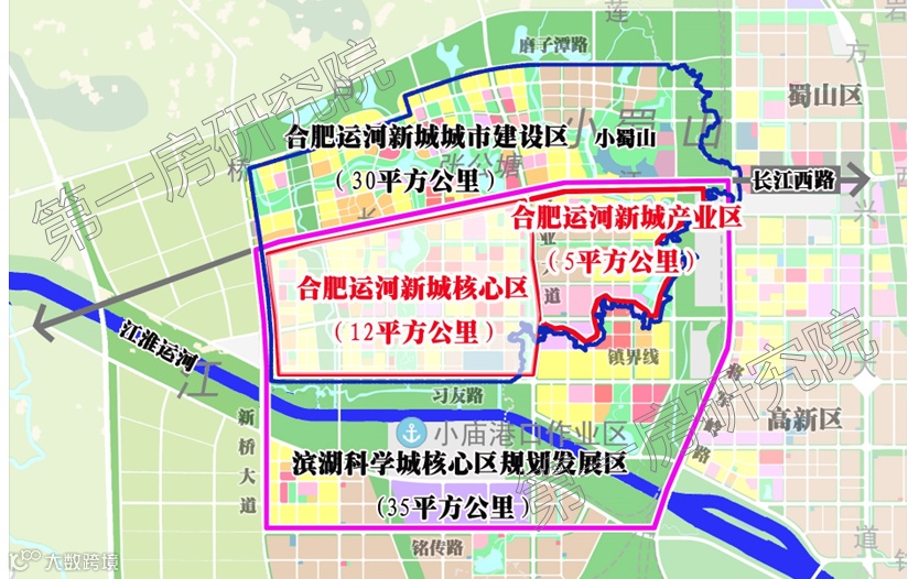 从板块角度来说的话,运河新城的定位能级较高,有着引江济淮工程计划做大的开发背景,且与合肥滨湖科学城总体规划密切衔接,以滨湖科学城核心区规划发展区与运河新城30平方公里城市规划区的重合区域作为运河新城建设启动区,实现了两规合一。