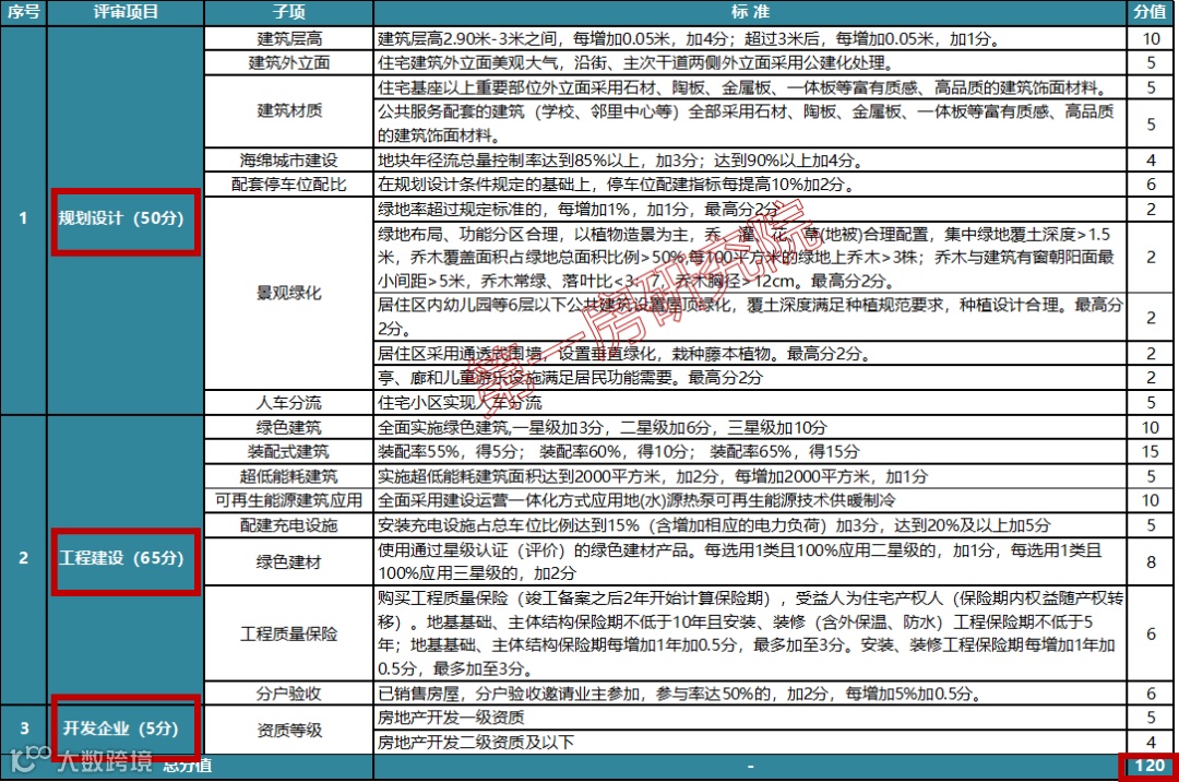 其实在合肥三批次土地拍卖竞品质调整之前,《合肥市商品住宅高品质建设内容和评分标准》的满分是120分,分为三大类别16个子项,其中规划设计50分,工程设计65分,开发企业5分。