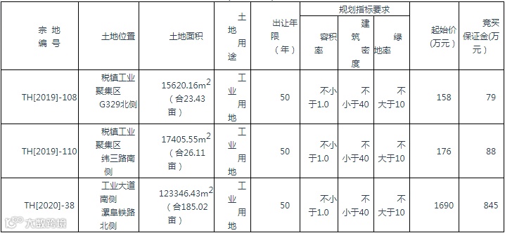 阜阳市太和县将挂牌出让3宗工业用地使用权,2宗位于税镇工业聚集区,1宗位于工业大道南侧、漯阜铁路北侧。递交竞买申请书及交纳竞买保证金截止时间为6月3日。