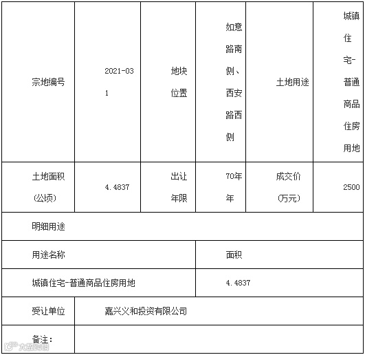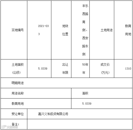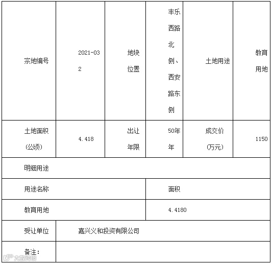 滁州市凤阳县1宗城镇住宅-普通商品住房用地、2宗教育用地使用权由嘉兴义和投资有限公司竞得。