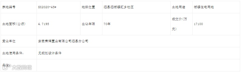 宿州市泗县泗城镇虹乡社区SX2020-45#号地块使用权由安徽荣辉置业有限公司泗县分公司竞得,规划用途为城镇住宅用地。