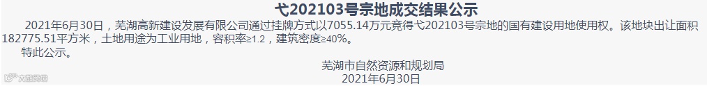 芜湖市弋202103号地块使用权由芜湖高新建设发展有限公司竞得,地块北至水系、南至天弋新能源变电站、西至花津南路、东至站前路,规划用途为工业用地。