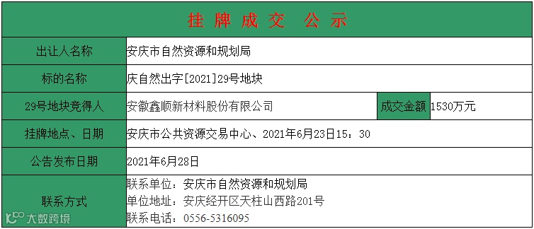 安庆市4宗工业用地、1宗二类仓储用地使用权成功出让。