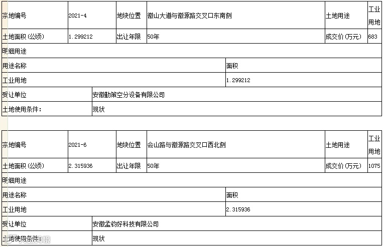 宣城市绩溪县2宗工业用地使用权分别由安徽勤策空分设备有限公司、安徽孟钧好科技有限公司竞得。