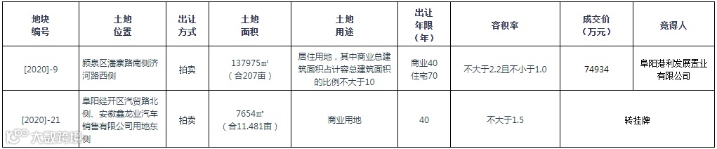 阜阳市颍泉区潘寨路南侧济河路西侧[2020]-9号地块使用权由阜阳港利发展置业有限公司竞得,规划用途为居住用地。