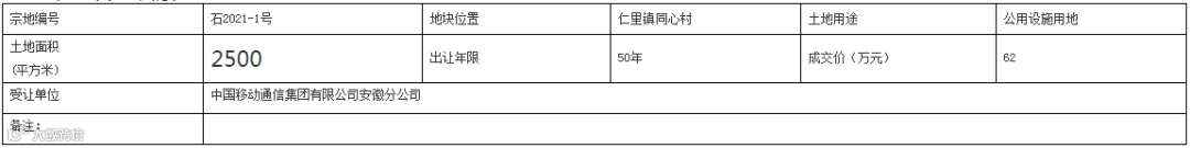 池州市石台县仁里镇同心村石2021-1号地块使用权由中国移动通信集团有限公司安徽分公司竞得,规划用途为公用设施用地。