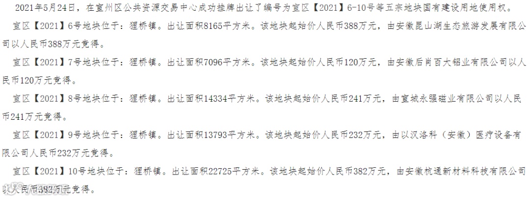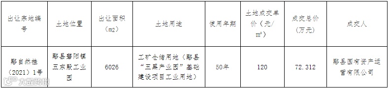 黄山市黟县碧阳镇五东殿工业园黟自然挂(2021)1号地块使用权由黟县国有资产运营有限公司竞得,规划用途为工矿仓储用地。