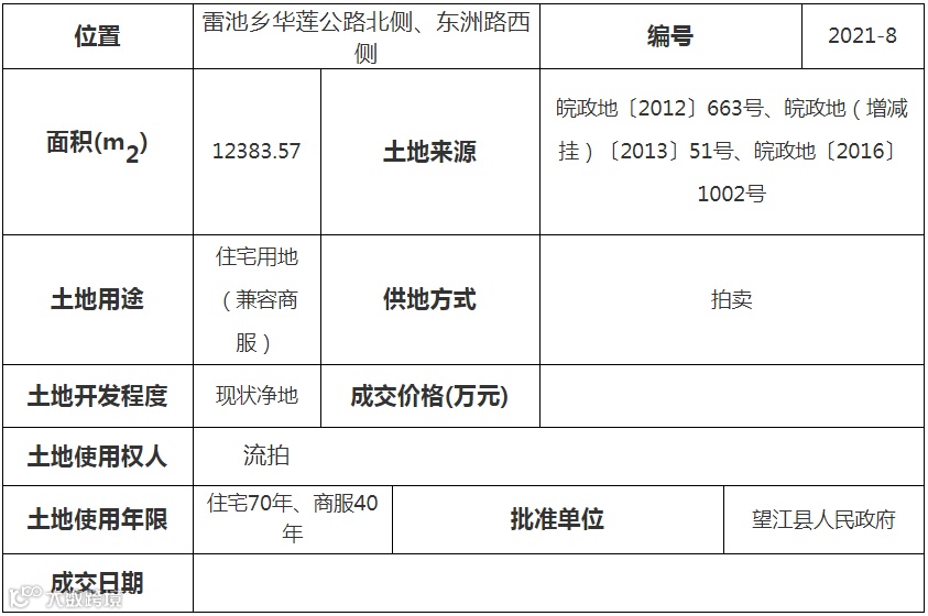 安庆市望江县雷池乡华莲公路北侧、东洲路西侧2021-8号地块使用权流拍,规划用途为住宅用地(兼容商服)。