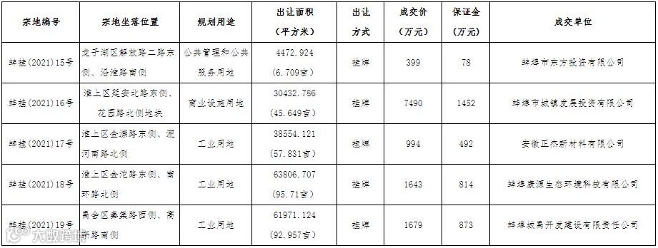 蚌埠市5宗土地使用权成功出让,包括3宗工业用地、1宗公共管理和公共服务用地、1宗商业设施用地。