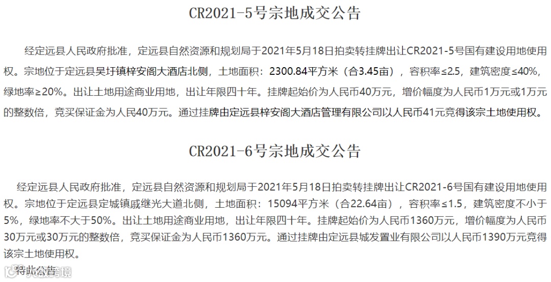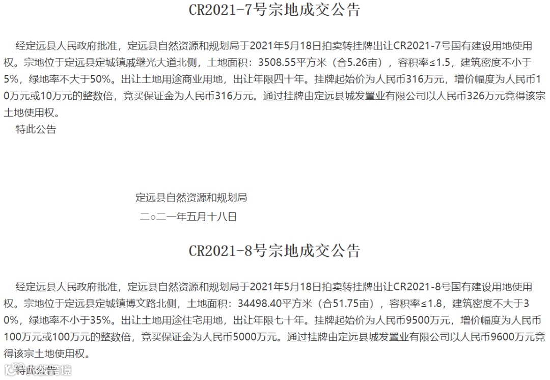 滁州市定远县8宗土地使用权成功出让,包括4宗商业用地、2宗住宅用地、1宗公用设施用地、1宗工业用地。