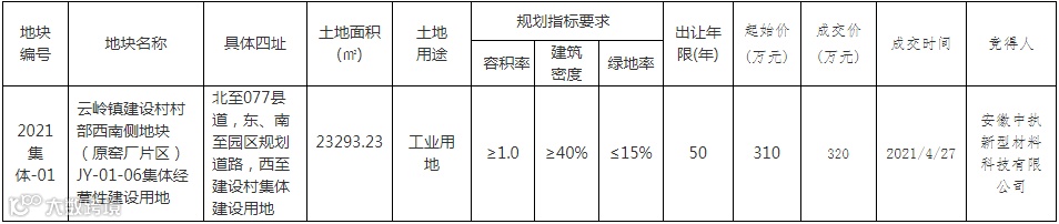宣城市泾县云岭镇建设村村部西南侧2021集体-01号地块使用权由安徽中执新型材料科技有限公司竞得,规划用途为工业用地。