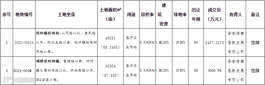 宿州市埇桥区2宗医疗卫生用地使用权由安徽埇康医教发展有限公司竞得。