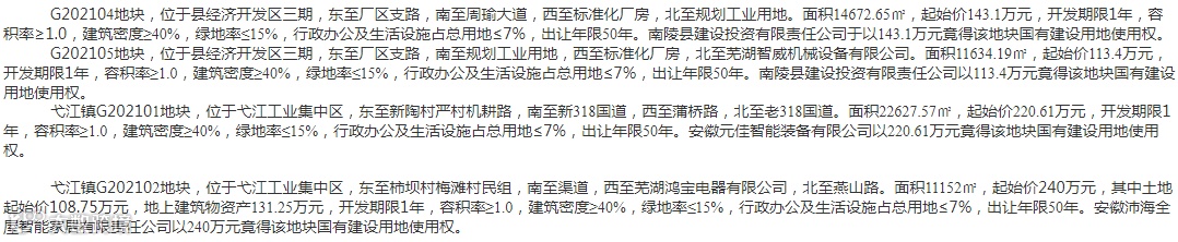 芜湖市南陵县4宗工业用地使用权出让成功,位于县经开区的2宗地块使用权均由南陵县建设投资有限责任公司竞得,位于弋江镇工业集中区的2宗分别由安徽元佳智能装备有限公司和安徽沛海全屋智能家居有限责任公司竞得。