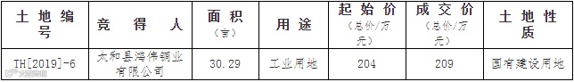 阜阳市太和县肖口镇新能源园区发展大道北侧TH[2019]-6号地块使用权由太和县鸿伟铜业有限公司竞得,规划用途为工业用地。