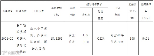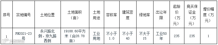 阜阳市阜南县将挂牌出让永兴路北侧、京九路西侧FN2021-23号地块使用权,规划用途为工业用地,申请人可于6月17日到7月19日提交书面申请。