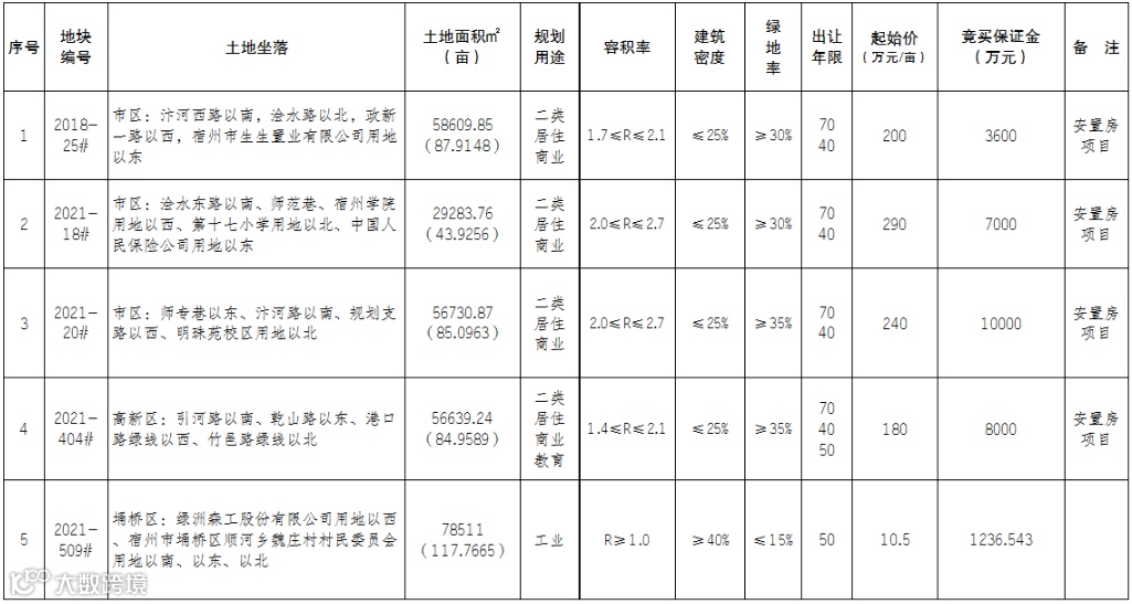 宿州市6宗土地使用权将出让,其中市区5宗地块申请提交期限为6月17日到7月14日,灵璧县1宗地块提交期限为6月17日到7月7日。