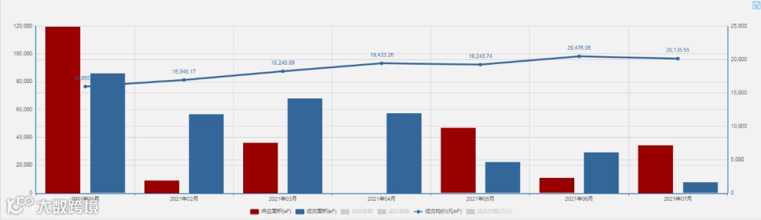 。2021年1-5月份,均价在1.5-1.9万/㎡之间。自6月起,区域均价突破2万/㎡。