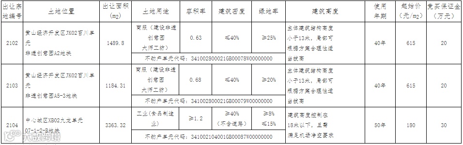 黄山市有4宗土地使用权将要出让,其中2宗商服用地(建设非遗创意园大师工坊)位于黄山经开区内,1宗工业用地位于中心城区XB02九龙单元07-1-2-B地块。