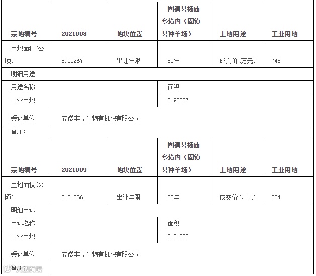 蚌埠市固镇县成功出让6宗工业用地使用权,4宗位于杨庙乡境内固镇县种羊场地块由安徽丰原生物有机肥有限公司竞得。