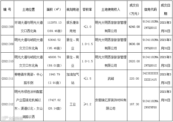 环湖大道与明光大道交口西北角的(2021)08地块为娱乐康体用地。上述3宗地块使用权竞得者均为明光大明西游旅游管理有限公司。