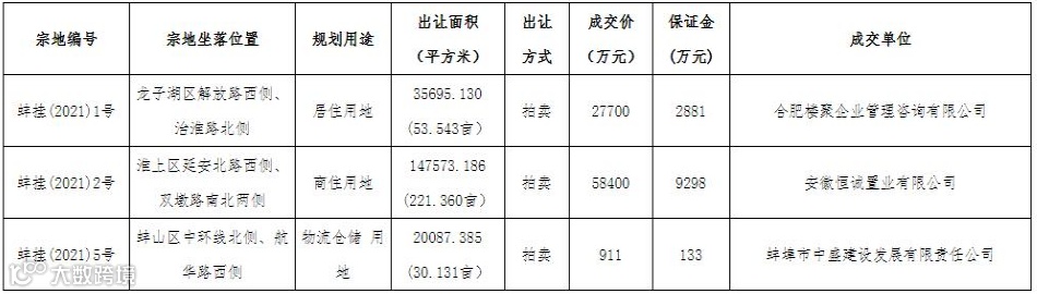 蚌埠市3宗土地使用权成功出让。