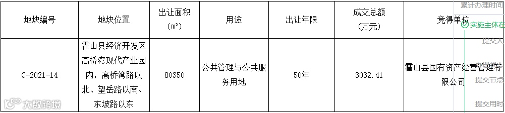 六安市霍山县经济开发区高桥湾现代产业园内,高桥湾路以北、望岳路以南、东坡路以东C-2021-14号地块使用权由霍山县国有资产经营管理有限公司竞得,规划用途为公共管理与公共服务用地。