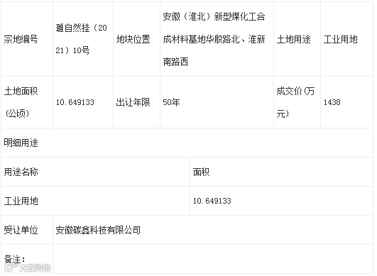 淮北市濉溪县安徽(淮北)新型煤化工合成材料基地华殷路北、淮新南路西濉自然挂(2021)10号地块使用权由安徽碳鑫科技有限公司竞得,规划用途为工业用地。