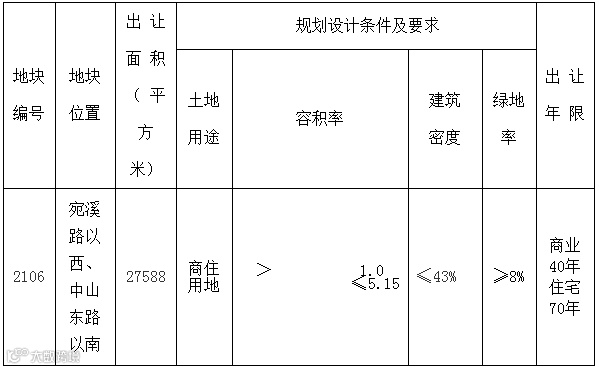 宣城市宛溪路以西、中山东路以南2106号地块使用权由安徽省福铭房地产开发有限责任公司竞得,规划用途为商住用地。