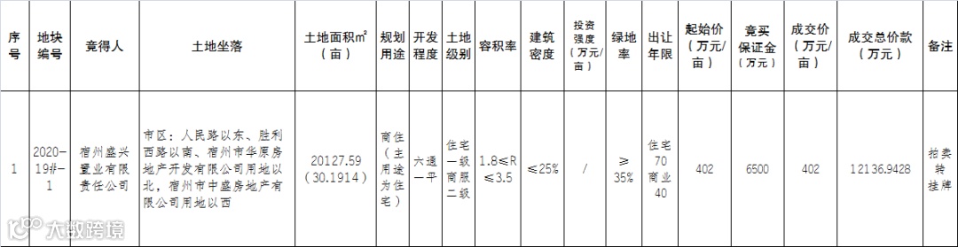 宿州市人民路以东、胜利西路以南、宿州市华原房地产开发有限公司用地以北、宿州市中盛房地产有限公司用地以西2020-19#-1号地块使用权由宿州盛兴置业有限责任公司竞得,规划用途为商住(主用途为住宅)用地。