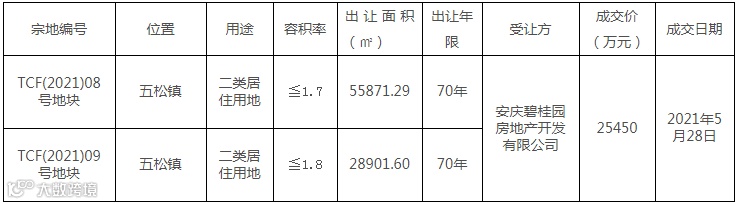 铜陵市义安区五松镇2宗二类居住用地使用权由安庆碧桂园房地产开发有限公司竞得。