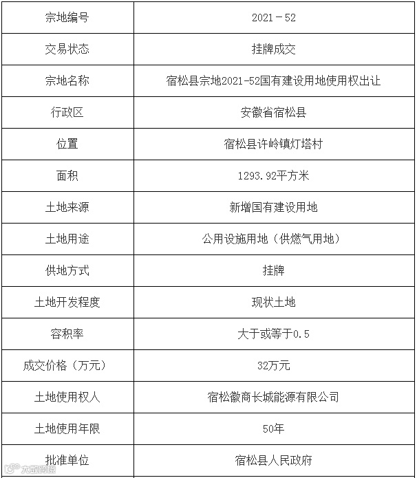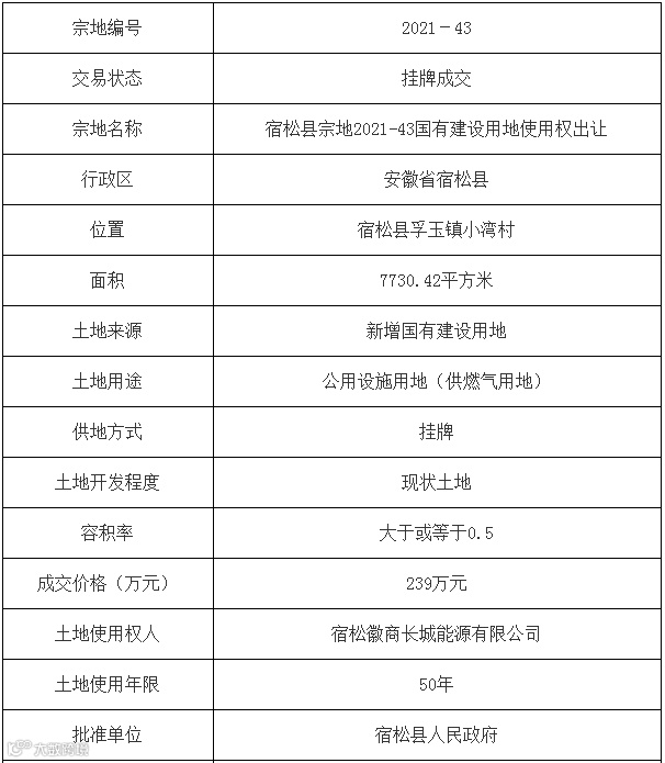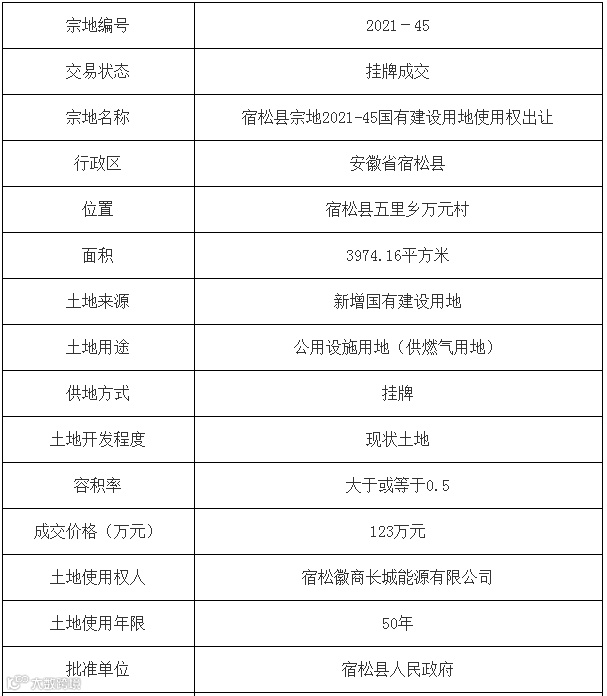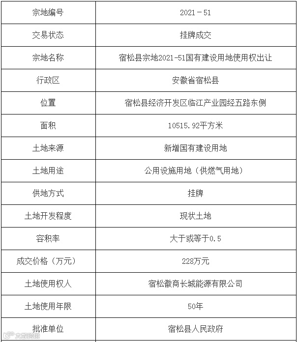 安庆市5宗公用设施用地(供燃气用地)使用权均由宿松徽商长城能源有限公司竞得。