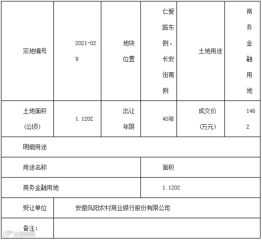 滁州市凤阳县仁爱路东侧、长安街南侧2021-029号地块使用权由安徽凤阳农村商业银行股份有限公司竞得,规划用途为商务金融用地。