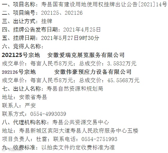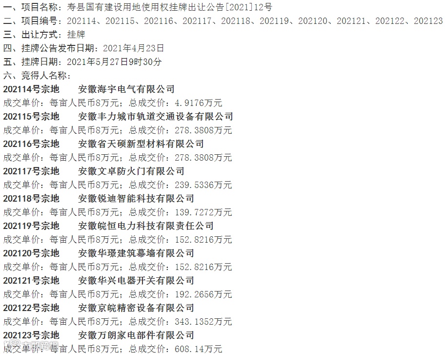 淮南市寿县12宗工业用地使用权成功出让。