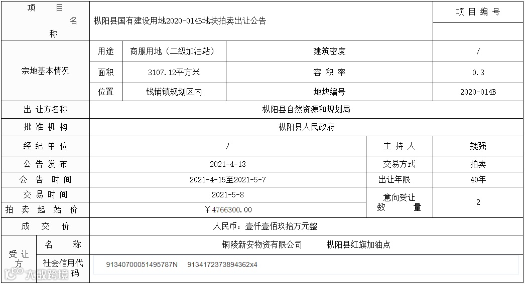 铜陵市枞阳县钱铺镇规划区内2020-014B号地块使用权由铜陵新安物资有限公司枞阳县红旗加油点竞得,规划用途为商服用地(二级加油站)用地。